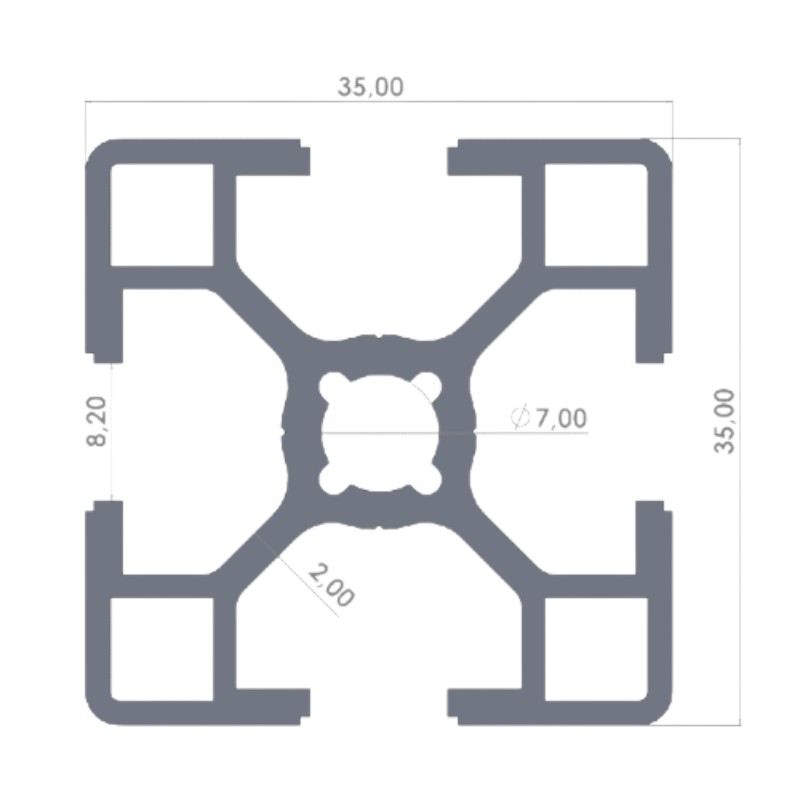 Boyut: 35×35 mm Malzeme: 6063-T6 Alüminyum Kullanım Alanları: Hafif yapı sistemleri, raflar, otomasyon projeleri